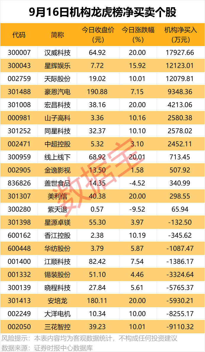 龙虎榜揭秘:机构净买入3股超1亿元今日龙虎榜中,净买入的个股13只,净卖出的个股9只。汉威科技、星辉娱乐、天际股份净买入金额均超1亿元。
