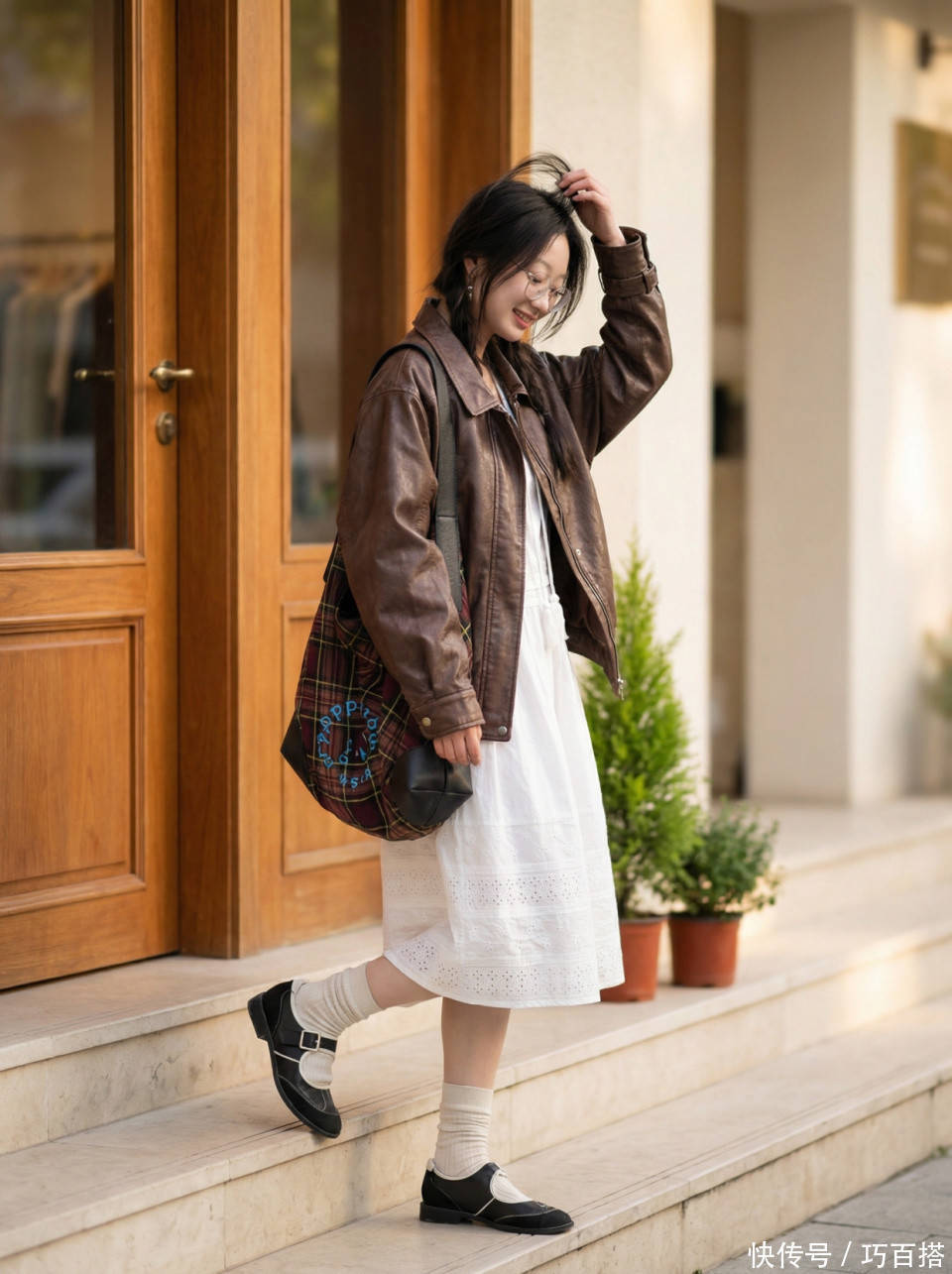 脸上有痘印或者斑点的姐妹,可以尝试浅色连衣裙叠搭深色外套,有效减少清爽浅色对脸部皮肤状态的影响,弱化浅色连衣裙打光板的作用,对脸部皮肤不光滑、不敢尝试浅色连衣裙的姐妹来说,是最安全的选择。