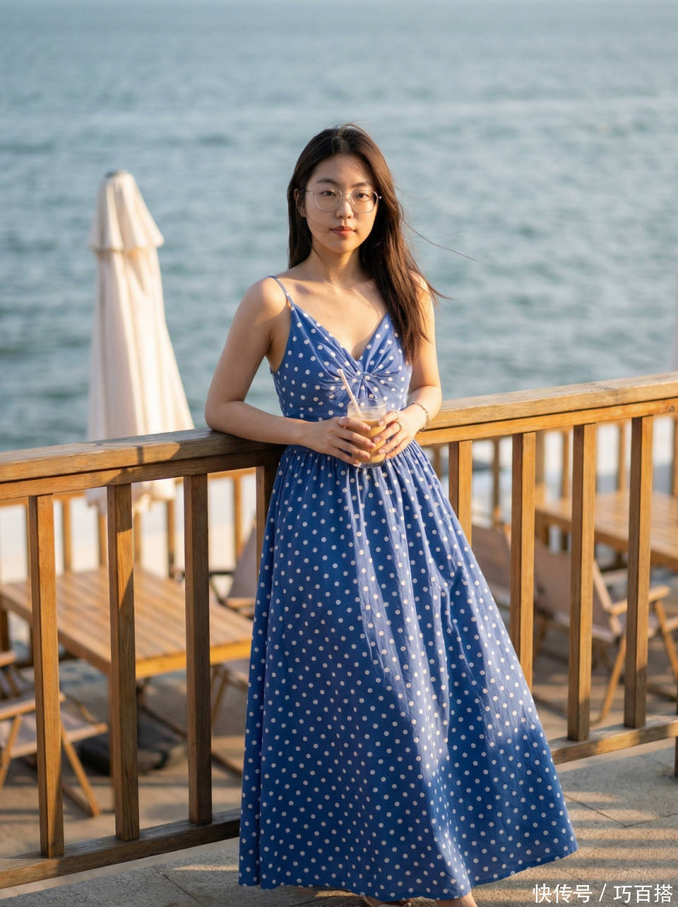 大家可以像博主一样选择蓝色吊带连衣裙,波点元素清爽迷人,把阳光大海穿在身上的感觉,别提多松弛了,度假旅游备一条,轻易不会出错。除了蓝色系连衣裙外,淡黄色,卡其色连衣裙也可以一试。