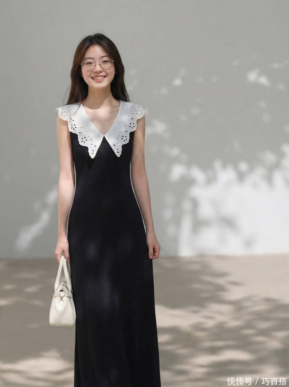 不喜欢印花款式的姐妹,可以选择衣领或裙边拼接白色木耳花边款式的连衣裙,纯黑色裙身、白色封边也能穿出理想效果。